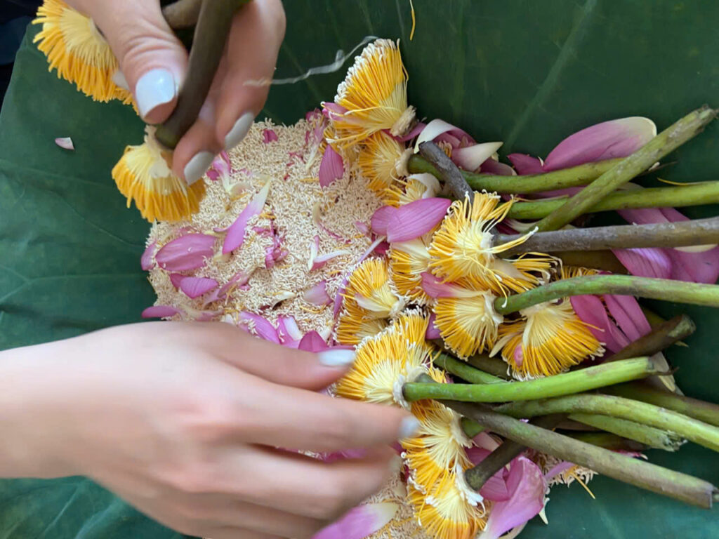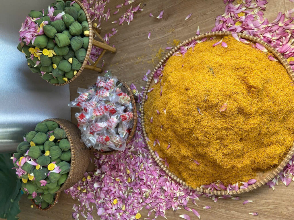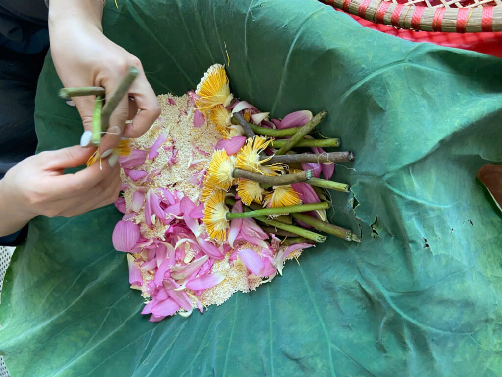 A layer of tea is spread over fresh lotus leaves, then a layer of stamens is evenly sprinkled on top. The process is repeated in layers – tea and stamen – then left overnight to allow the tea to absorb the fragrance.