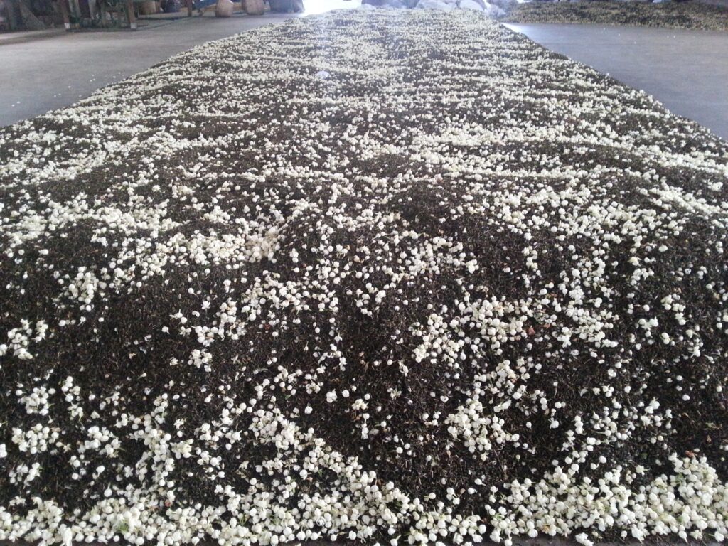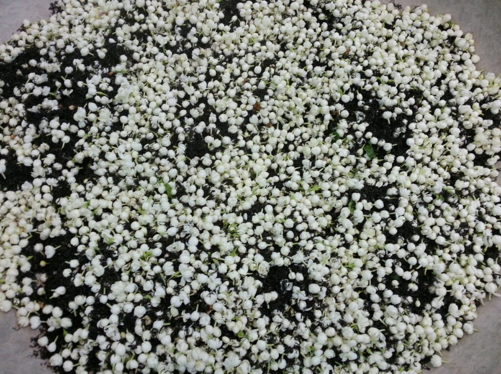 Between 8-9 PM, when jasmine blooms release their strongest aroma, tea leaves are spread out and covered with jasmine buds. The mixture is then gently stirred.