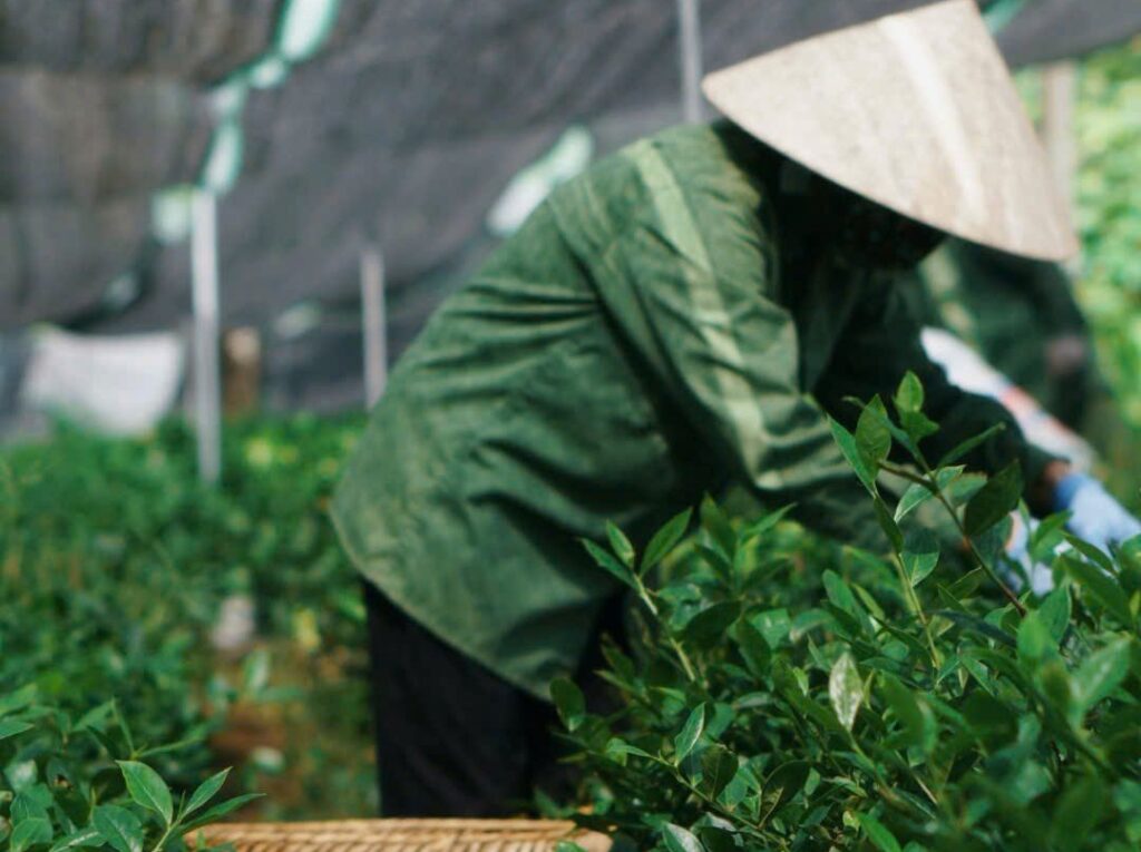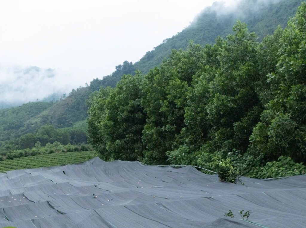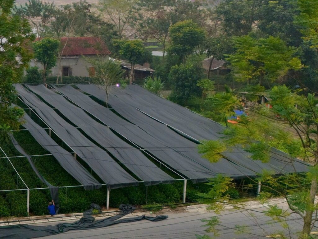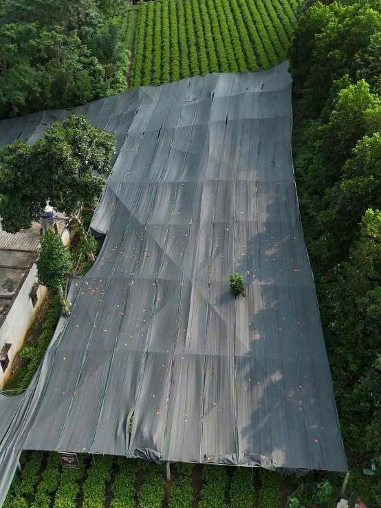 These are images of the tea-growing areas covered with nets for producing steamed green tea. The shading nets are used to control sunlight exposure, reduce photosynthesis, and enhance the accumulation of amino acids such as L-theanine, resulting in a sweeter, richer umami flavor in the final tea.